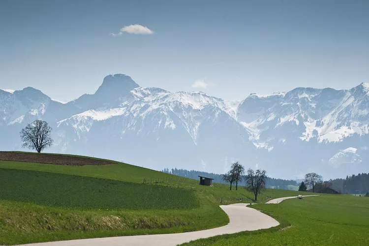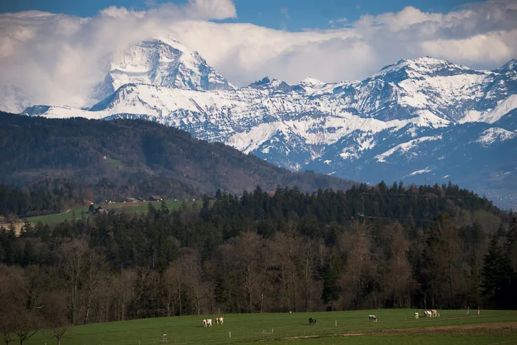 Being Easter weekend, Jo and I decided to spend the weekend exploring new places. We started today by getting the train and bus to the top of a hill between Thun and Bern, to walk across the rolling hills with views of the Alps between Gerzensee and Kiesen. You can see the full route we took on Google Maps.