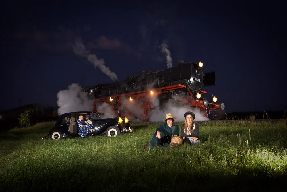 The idea for the evening shots sprang from the American photographer O. Winston Link, who made a living and a name for himself by setting up huge banks of lights to illuminate scenes of classic Americana, featuring drive-in cinemas, steam trains, train stations and viaducts. We wanted to emulate Link’s techniques using modern equipment and shoot colour photographs of the train in action; a volunteer additionally managed to bring a classic Citroën along too, so the group could work with the locomotive and car together, also using some volunteers dressed in period costume to make the scenes complete.