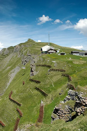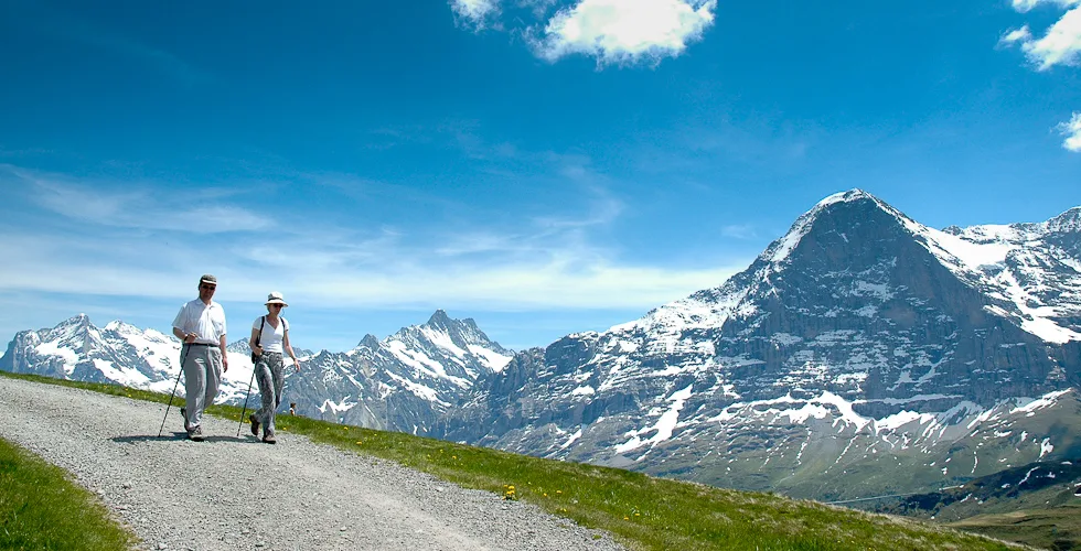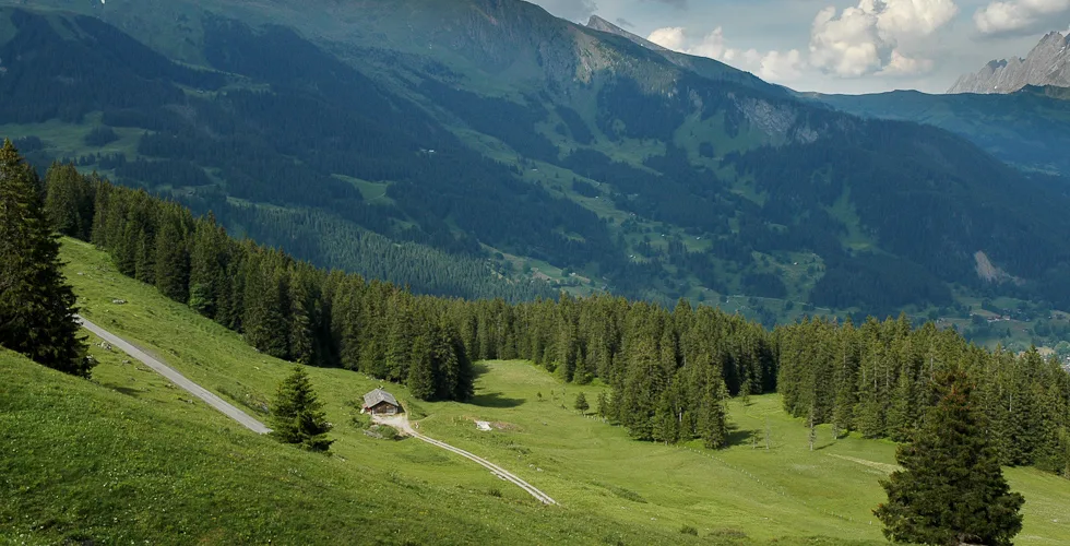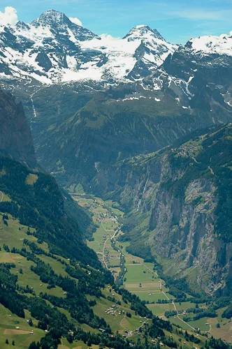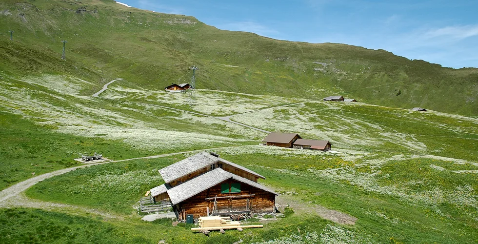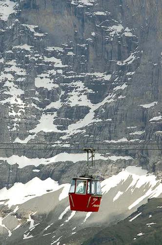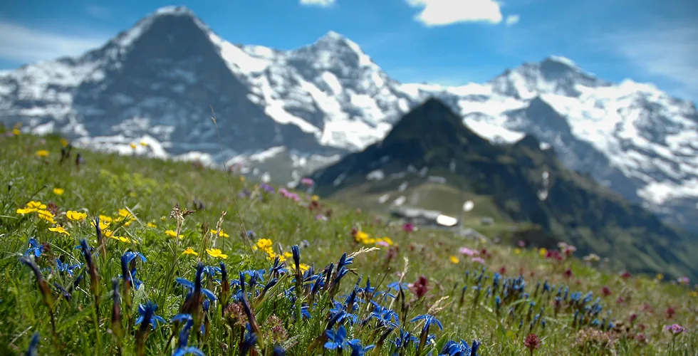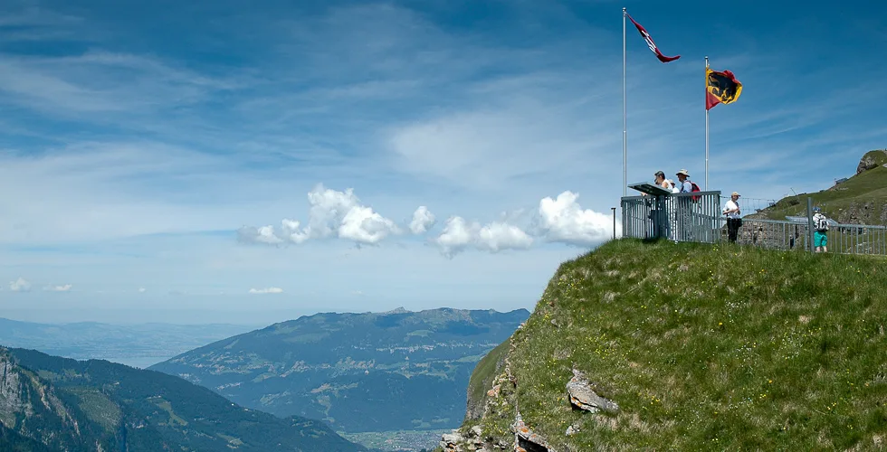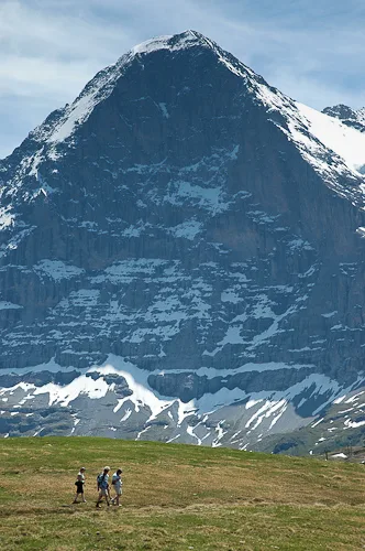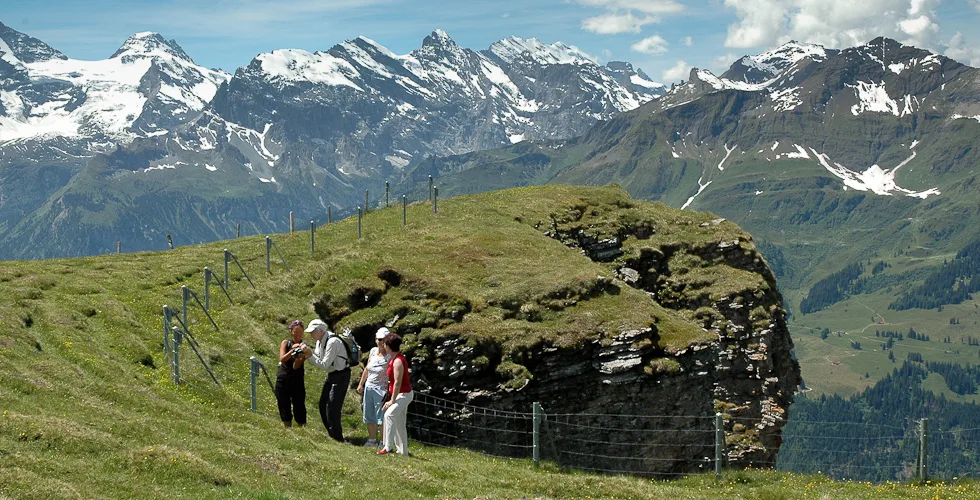 Männlichen is an alpine plateau in the Jungfrau Region of central Switzerland, high above Grindelwald to the east and the Lauterbrunnen Valley to the west. The slopes are home to free-roaming cattle in the summer and much of the mountain is covered with carpets of alpine flowers, interspersed with winding mountain tracks and the occasional cow shed and ski lift station. The mountain-top restaurant is reached by cablecars from valleys on both sides, while the peak of the Männlichen ridge, at 2,345 metres above sea level, affords momumental views to Stechelberg, Grindelwald, Grosse Scheidegg and Interlaken, and even as far as Thun and the Thunersee. The photos in this gallery are from a trip to Männlichen in 2005, when Jo was visiting me for a summer holiday.