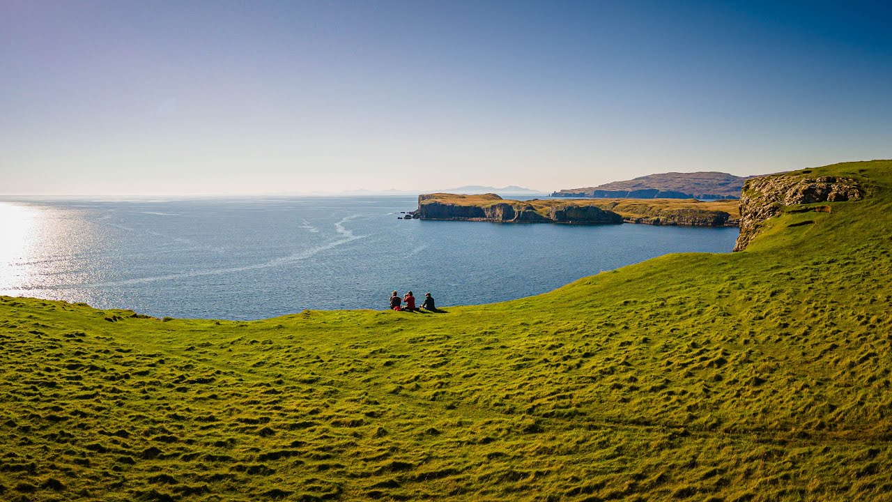 It was a simple ascent from there to the main summit of the little island, where you get magnificent views to Fiscavaig and Wiay, thence right along the coast to Macleod’s Maidens and on to the Outer Hebrides. We sat and enjoyed the warm sun for a while, and I sent my drone up and out to the far extent of its range, so that I could film the dramatic headland from above.